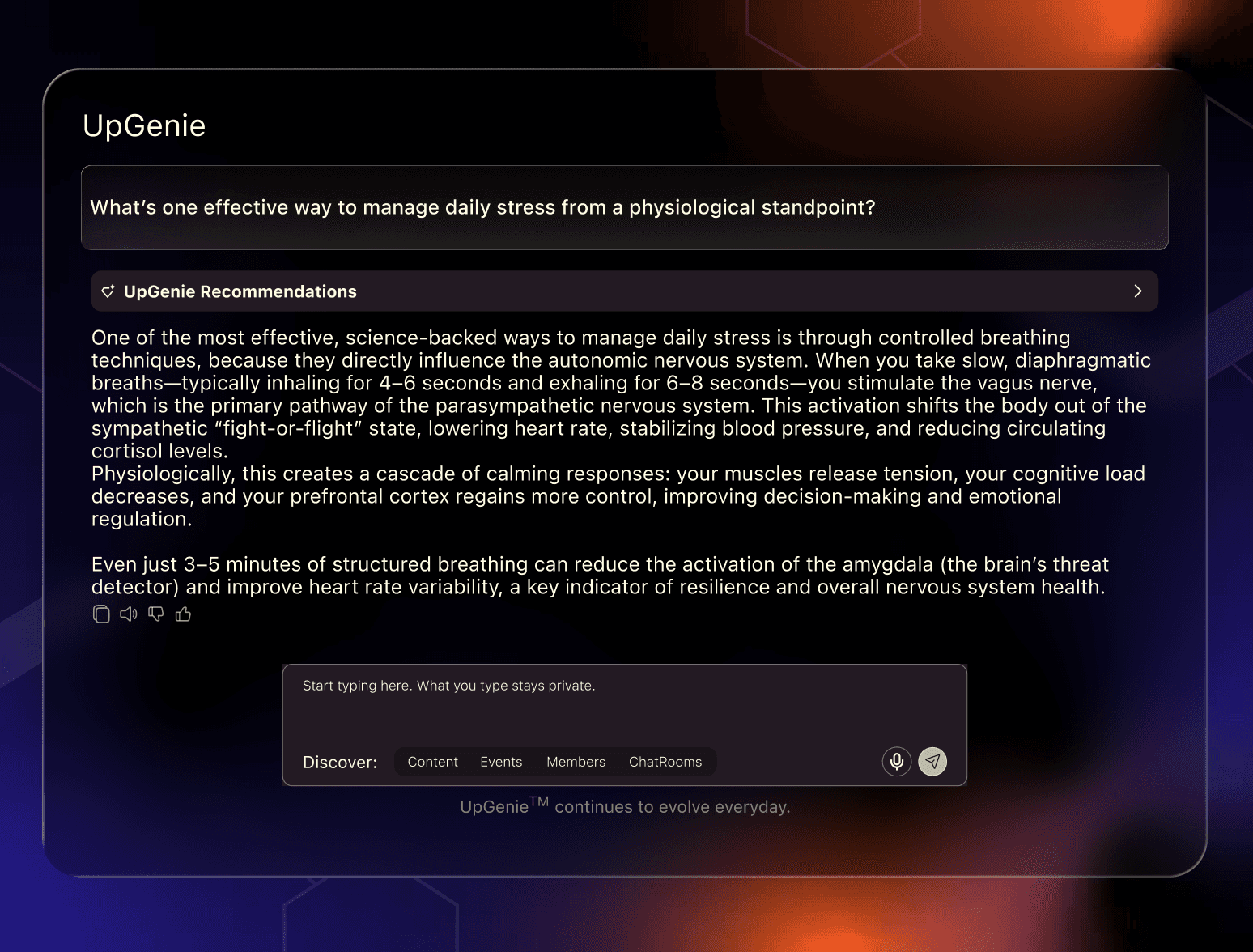 No point solutions. UpGenie delivers knowledge, learning, news, connections, and experiences through one multitasking LLM within your hub.